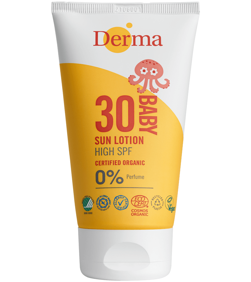 Dermas babysollotion er certificeret med Svanemærket, Asta- og Allergimærket, allergicertificeret og bærer Ecocert Cosmos Organic-mærket. Den er dog ikke dermatologisk testet.