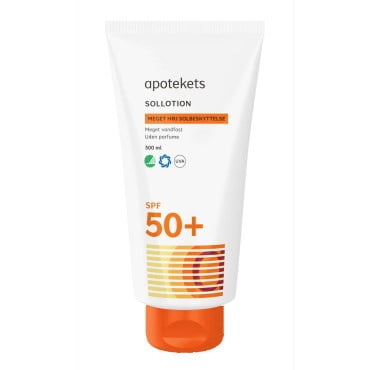Apotekets sollotion er certificeret med Svanemærket, samt Astma- og Allergimærket. Den er dermatologisk tester og uden parfume.